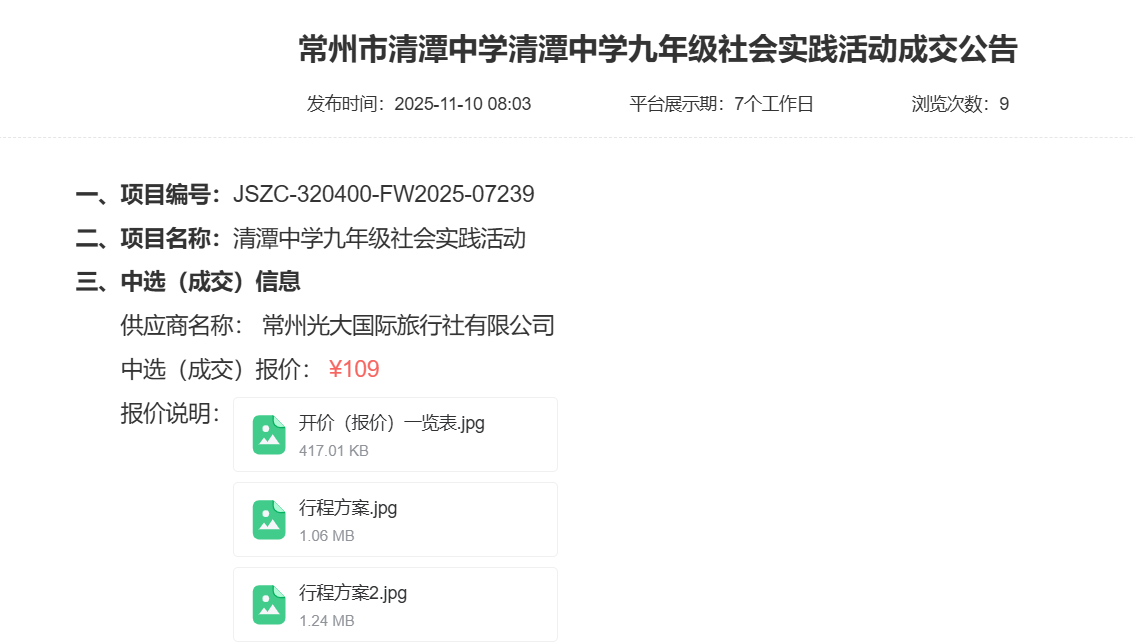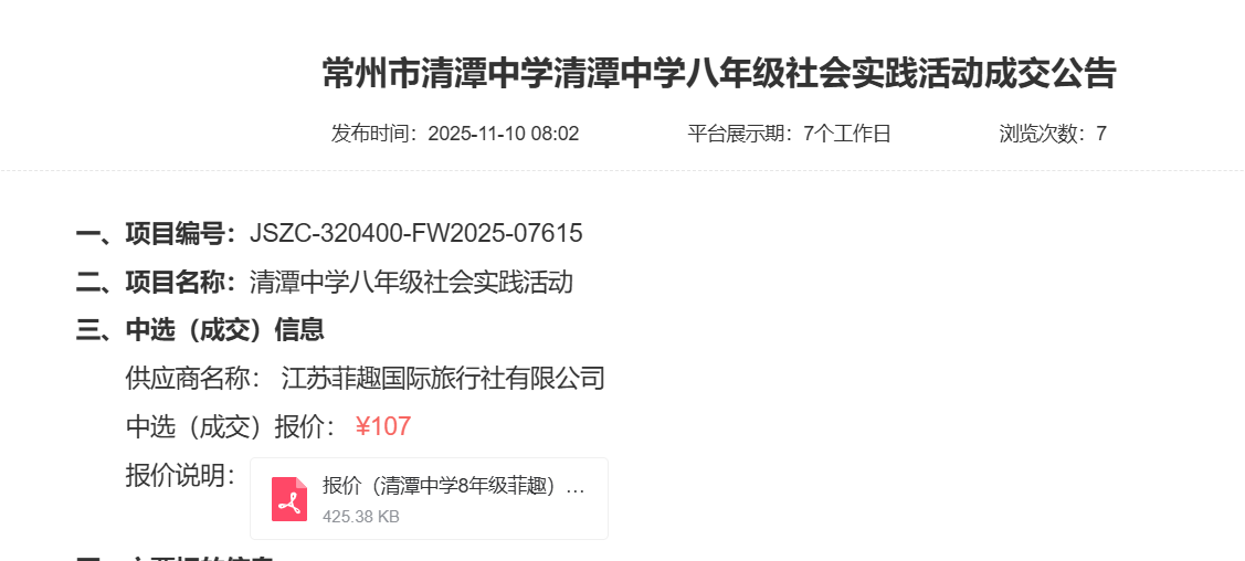 四、招标公平性保障措施 为充分保障本次招标工作的公平性,拟定实施两项核心措施:一是三个年级分开招标,避免交叉影响;二是每个年级分别邀请3家旅游服务公司参与网上投标,形成有效竞争。最终将综合考量,选择最低价且服务质量达标的公司,为我校本次社会实践活动提供服务。 五:社会实践中标结果 见附件