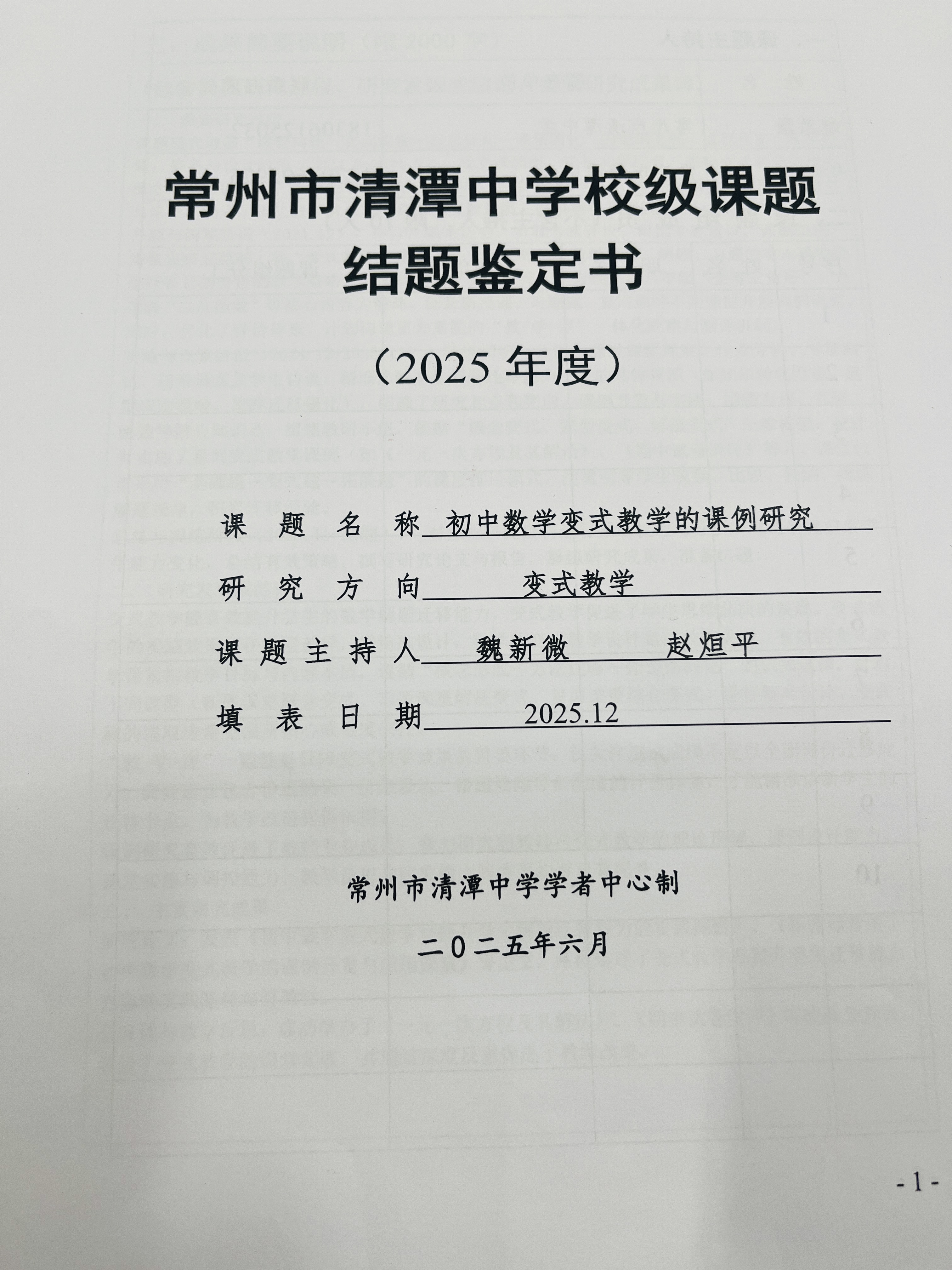 《初中数学变式教学的课例研究》中期评估表